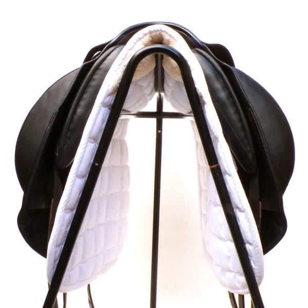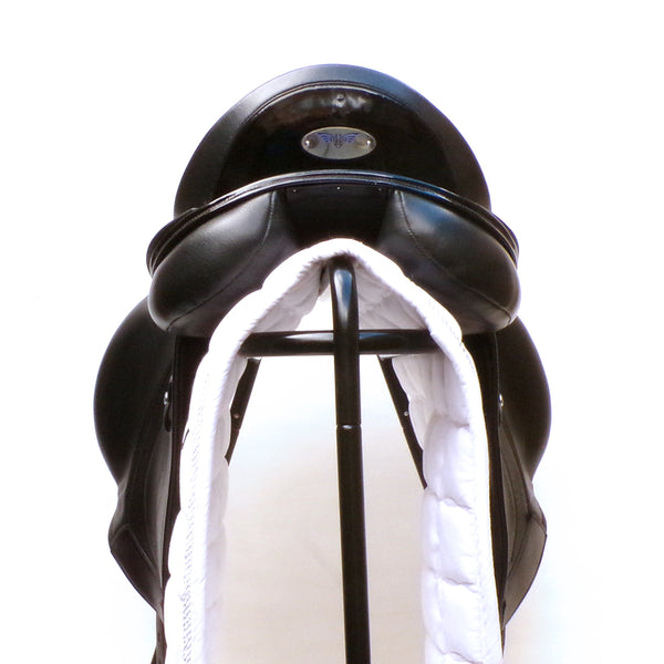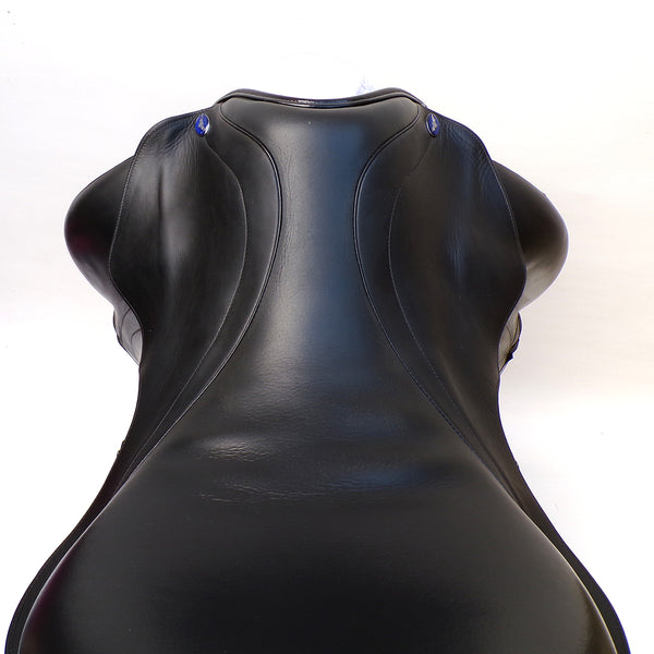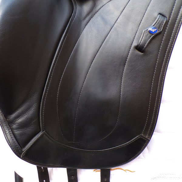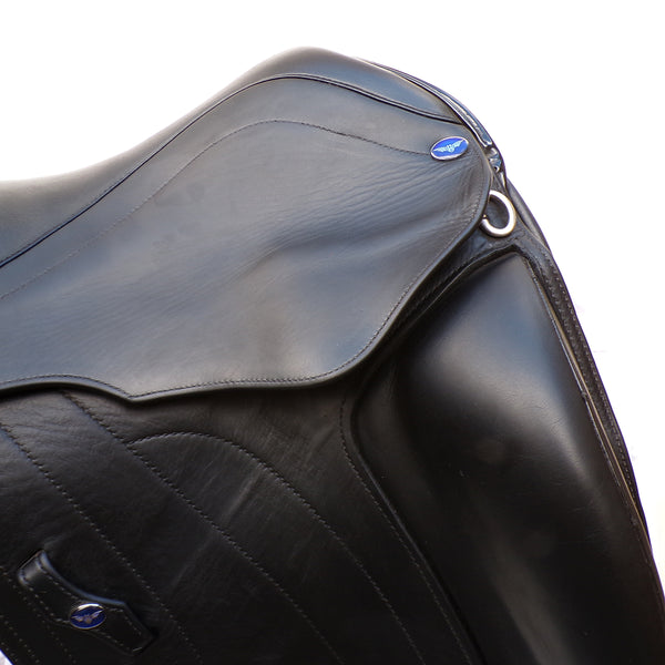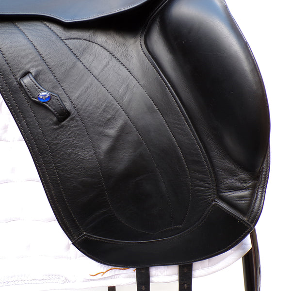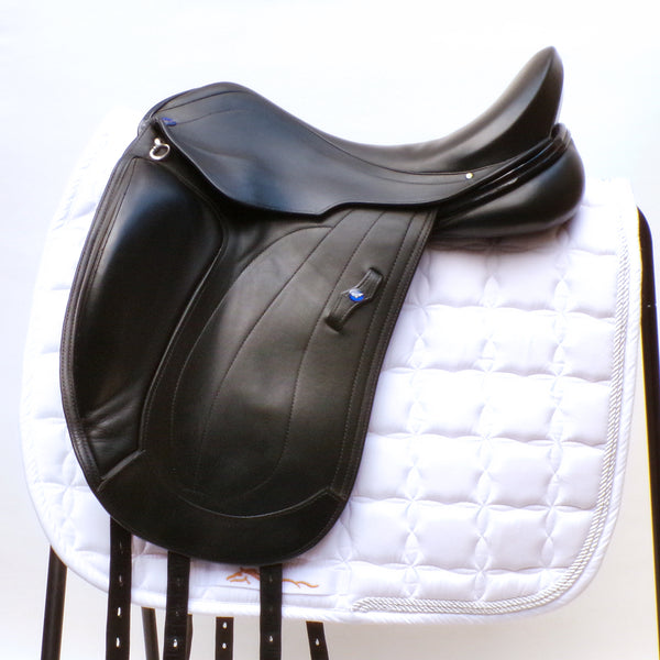 The Athena is a technical and attractive Monoflap dressage saddle by Utopia saddles. This used saddle is narrow in the twist and Monoflap design to promote extreme close contact to the horse. With a cleverly designed knee block which supports above the knee allowing the riders lower leg maximum freedom of movement.
